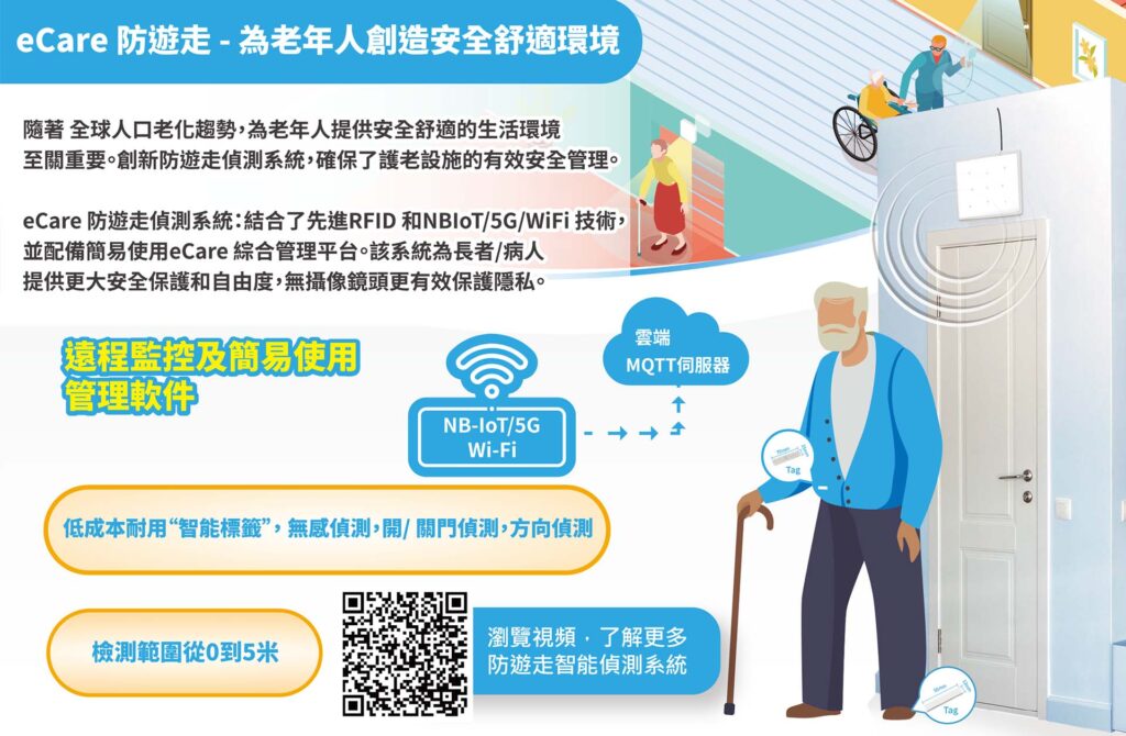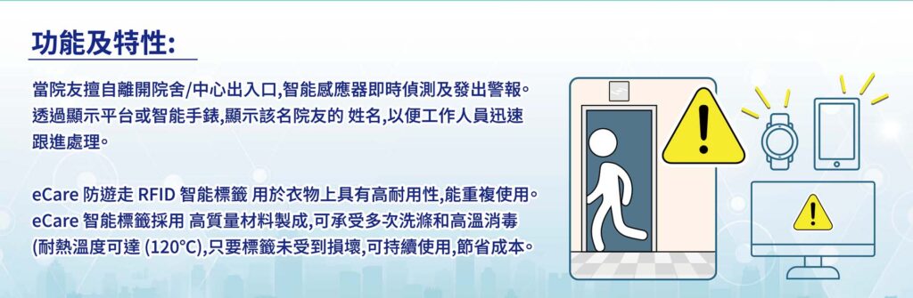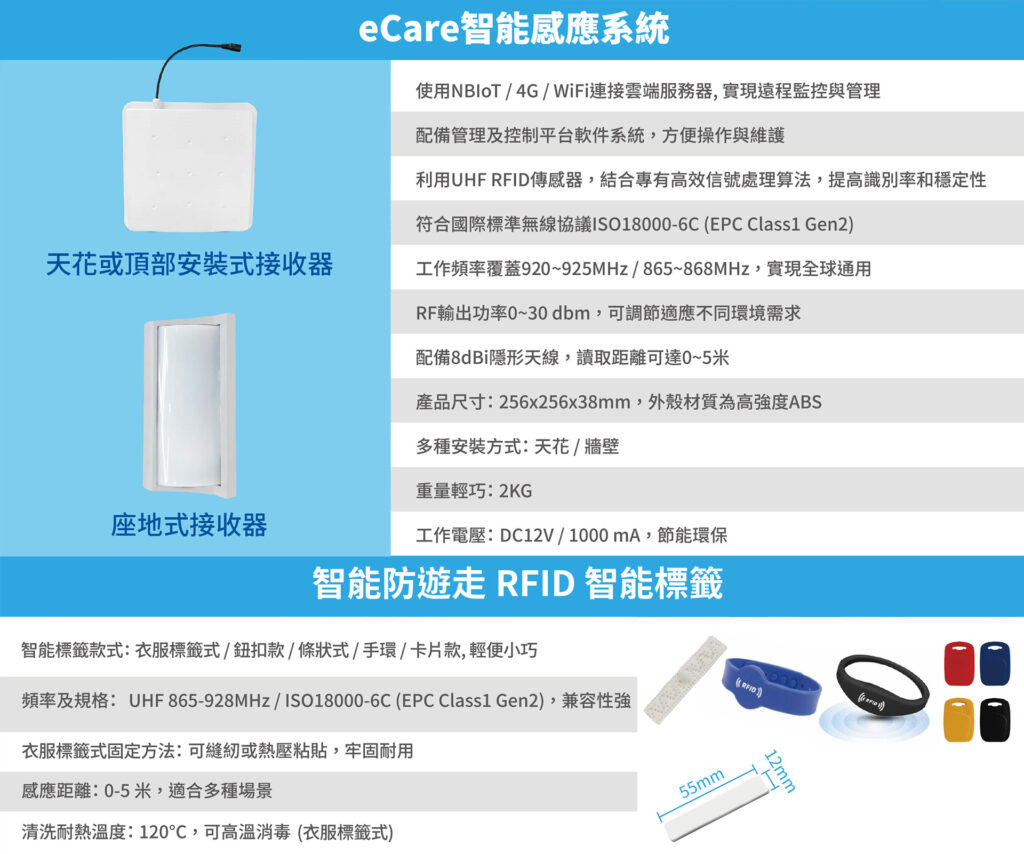 Smart · HealthCare 防遊走智能偵測系統 安裝範例 天花板懸掛 壁掛式 eCare防走失系統 這是一款創新的防走失系統,支援養老院的安全管理,為老年人提供安全的生活環境。 它結合使用標籤讀取器、電子設備感測器、蜂窩訊號和Wi-Fi,以提高可靠性。 由於不使用攝影機,隱私也得到了保護。 Certificate